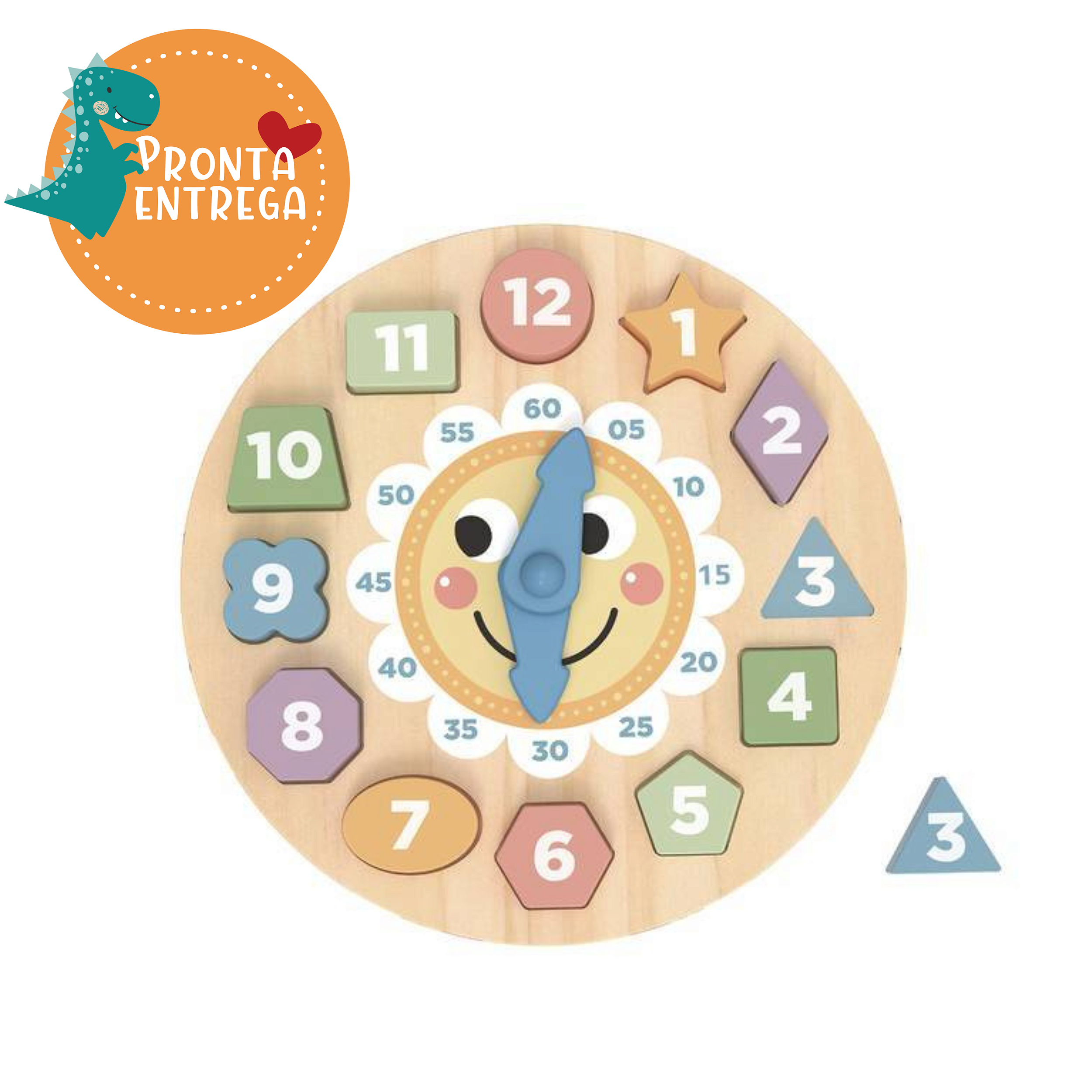 Com seu design encantador e tons pasteis, este quebra-cabeça de relógio em madeira envolve as mentes dos pequenos em uma exploração interativa do tempo e das formas.