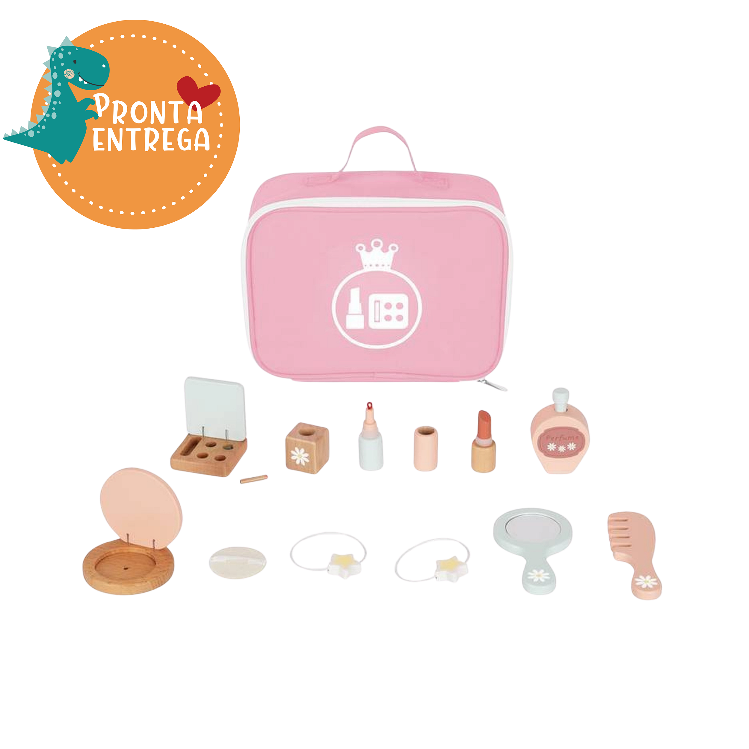 Todas essas peças são cuidadosamente armazenadas em uma linda maleta de tecido cor de rosa para que nossas pequenas artistas maquiadoras possam viajar para qualquer lugar, transformando imaginação em histórias inesquecíveis.
