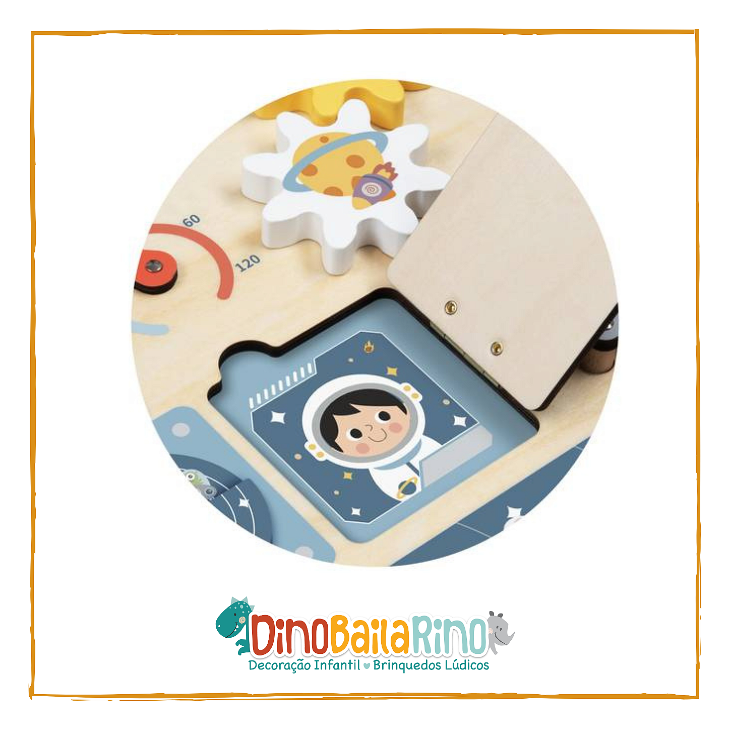 Este quadro encantador apresenta uma variedade de atividades práticas, incluindo botões para apertar, alavancas para puxar, mostradores para girar e engrenagens para girar, tudo em um tema espacial cativante.